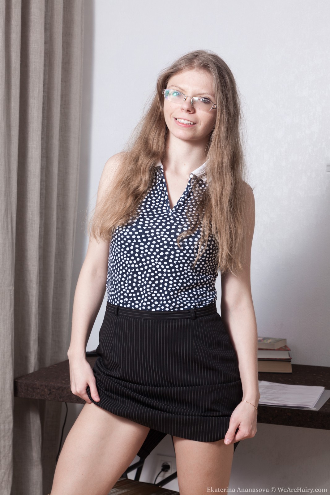 Description: Ekaterina Ananasova sits at her desk reading and showing off her panties up her skirt. She strips bare and jacks her hairy pussy a lot. She finishes by tugging and orgasming at her desk.